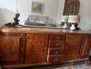 Sala anni 30 legno massiccio in radica lavorazione artigianale. Tavolo 1.90 quattro sedie, buffet e controbuffet + 2 specchiere