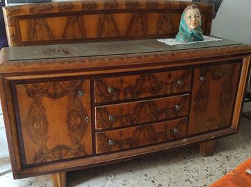 Sala da pranzo anni 50 in radica di noce composta da 2 mobili di cui uno con specchio e una vetrina bar a vista.