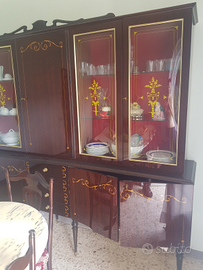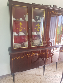 Vetrina 4 ante con vetro bombato e stampo disegno di color giallo,4 cassetti nella parte centrale, 8 piedini in ottone.