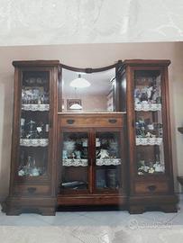 Sala da pranzo in legno stile liberty 900 completa di tavolo quadrato con n. 6 sedie in legno, mobile alto a quattro ante in vetro e specchio centrale, mobile basso a quattro ante e specchio centrale. Lampadario in ottone ad otto bracci e con gocce pendenti. Prezzo trattabile.