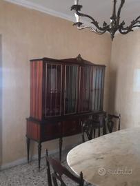 Sala da pranzo anni '50 composto da tavolo con piano in marmo, 6 sedie, mobile basso con specchio e mobile con cristalliera.