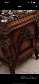 Sala da pranzo stile barocco (materiale legno massello pregiato), composta da tavolo con due prolunghe e 8 sedie legno massello rivestute con tessuto velluto rosso, di cui 2 sedie Trono Poltrona con braccioli. La credenza internamente ha la luce e le vetrine sono decorate oro.