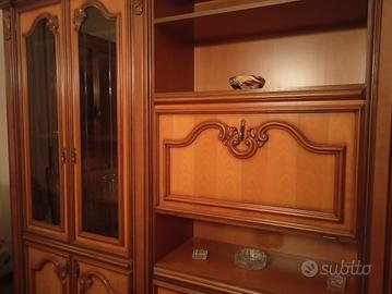 Sala da pranzo classico in legno, con credenza angolare modulare, con ante sia in vetro che in legno.