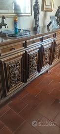 vendo importante sala da pranzo in legno decorato con grande tavolo con 6 sedie, cristalliera e credenza. per chi interessato disponibile altre foto, video e sopralluogo in loco. è in legno massiccio