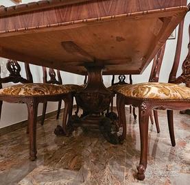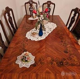 Splendido tavolo da pranzo rettangolare finemente lastronato e intarsiato in varie essenze pregiate. Gamba centrale, ospita comodamente 6 persone. Piano ben lavorato e modanato con bordo sagomato, non solo adatto ad essere ubicato in casa, ma essendo di grande effetto, e considerate le dimensioni, può essere inserito anche in studi professionali e usato come tavolo da riunione. Venduto con o senza sedie.