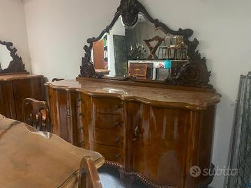 • 2 credenze abbinate con ampie specchiere decorate, i ripiani sono in marmo rosso Verona.