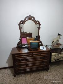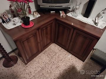 Sala da pranzo: Credenza 4 ante + una centrale e cassetti (legno+vetro) + mobile per TV fatto ad angolo (Legno) 199€ + 40€ divano. Anni 80