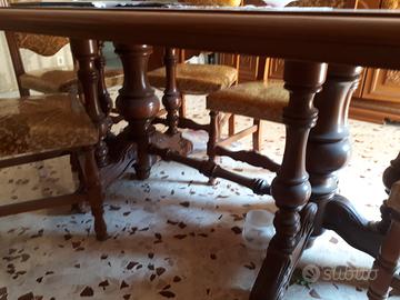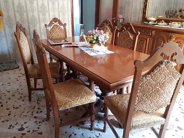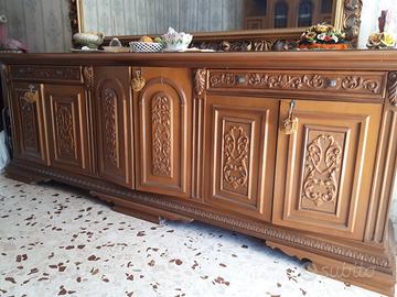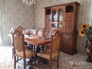 Vendo causa trasloco intera sala da pranzo in stile classico con mobili realizzati interamente in legno. Pregiati intarsi sulle ante delle porte, gambe e trave centrale del tavolo.