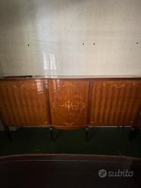 Credenza con intarsi e impiallacciatura in legno, tavolo con vetro e sedie in pelle, consolle classica con intarsi in legno