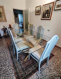 Vendo sala da pranzo completa in radica di noce con tavolo di cristallo anni 80 in perfetto stato, con 6 sedie + tavolo basso da caffè (stesso stile)