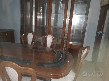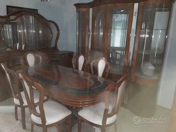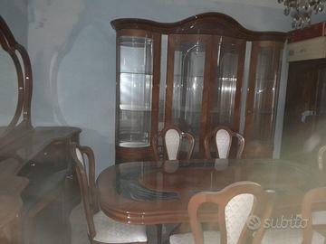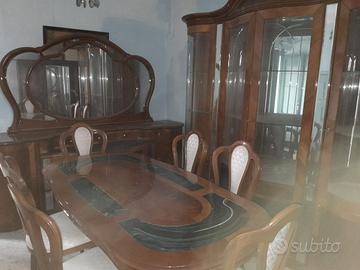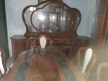Vendesi splendido set completo per sala da pranzo in stile classico, caratterizzato da finiture di alta qualità e dettagli ricercati. I mobili sono realizzati in legno con una calda tonalità noce/ciliegio, ideali per arredare con eleganza un salone o una zona giorno di rappresentanza. Il set comprende: • Tavolo da Pranzo Imperiale: Tavolo ovale di ampie dimensioni con raffinati intarsi in marmo scuro venato sul piano. La struttura è solida e finemente lucidata. • Set di 6 Sedie: Sedie coordinate in legno con schienale lavorato. La seduta e l'inserto dello schienale sono imbottiti e rivestiti in un elegante tessuto damascato color panna/crema, in ottime condizioni. • Cristalliera/Vetrina Monumentale: Grande mobile a 4 ante con vetri curvi laterali. Dispone di ripiani interni in vetro, perfetti per esporre servizi di piatti e cristalli. Coronamento superiore sagomato. • Credenza con Specchiera: Mobile basso abbinato con cassetti e ante, sormontato da una maestosa specchiera con cornice lavorata a doppia voluta. Stato dell'oggetto: Il mobilio è stato tenuto con estrema cura. Presenta la naturale lucentezza del legno e non presenta difetti strutturali. Prezzo: 2.500 € (Trattabile se interessati al set completo) Note per il ritiro: • Smontaggio e trasporto a carico dell'acquirente. • Disponibile per visione previo appuntamento. • Località: Bellona (CE)