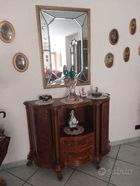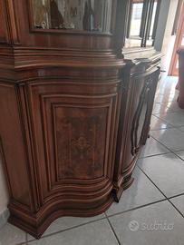 Vendo sala da pranzo completa in radica di noce, composta da vetrina con 4 ante, console con specchiera, tavolo rotondo allungabile e 4 sedie in velluto marroncino. Ottimo stato. Ritiro e smontaggio a carico dell'acquirente, se interessati contattare in privato.