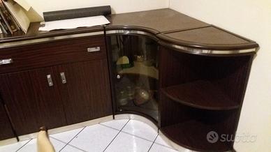 ORIGINALE ANNI 70 COMPLETA DI MOBILE / VETRINA ALTO E MOBILE BASSO AD ANGOLO PIù TAVOLO CON 4 SEDIE , COLORE NOCE , TAVOLO CM 120X90X78,5H. MOBILE 325X200H. X 112 P. X43P. , SMONTAGGIO E RITIRO A CARICO DELL'ACQUIRENTE