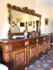 Vendesi sala da pranzo completa. Credenza mobile con specchiera, tavolo con 6 sedie e lampadario.