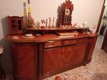 Tavolo color noce chiaro ovale con 6 sedie, credenza con ante, cristalliera alta. Tutto in buone condizioni. No spedizione ma possibile ritiro a carico dell'acquirente