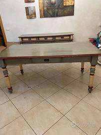 set completo sala da pranzo in ciliegio massello dipinto a mano (cristalliera, credenza, tavolo e 4 sedie), in stile arte povera / shabby chic, composto da:
