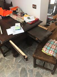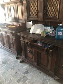 Vendo come da tirolo sala da pranzo epoca rinascimento con piedi di leone, completa di buffet, contrò buffet, tavolo allungabile e sedie con seduta e schienale in pelle da sistemare. Prezzo trattabile e ritiro a carico dell’acquirente