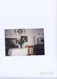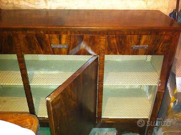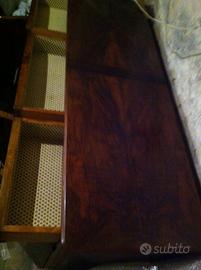 Una base con vetrinetta o specchio + tavolo rettangolare tutto impelliciato noce. Uno sportello della base mancante di una maniglia, reperibile in qualche mercatino di antiquariato. Tutto in buono stato. Vendibile anche a singoli pezzi.