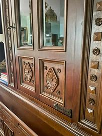 Sala da pranzo completa, composta da tavolo più sei sedie, una credenza alta con vetrate e una credenza bassa. Tutti gli articoli sono in legno stile spagnolo. Non spedisco, ritiro in zona Frosinone alta.