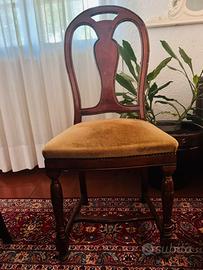 •6 sedie coordinate con schienale sagomato e seduta imbottita in tessuto color senape, comode e resistenti.