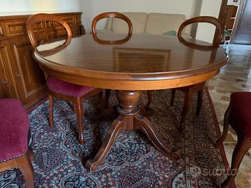 mobili per sala da pranzo in noce nazionale , completo di credenza 260x50 h91 cm , vetrina 145x40 h200 cm , tavolo rotondo diametro 118 h 71 allungabile , 6 sedie imbottite (appena rifatte) .
