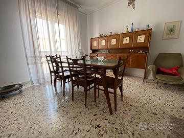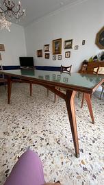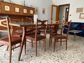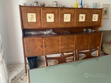 Sala pranzo completa con mobile Bar in buone condizioni (manca una maniglia)tavolo di legno con piano in vetro 180 x 75 e 6sedie con fondo in pelle ..e buffet bellissimo pero ha il fondo sano ma che al centro ha ceduto … ogni portella è decorata con dei riquadri in vtro con all’interno fiori secchi