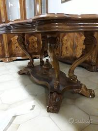 sala da pranzo in radica di noce e intarsiata originale, composta da: una vetrina, un credenzone , un tavolo e 6 sedie