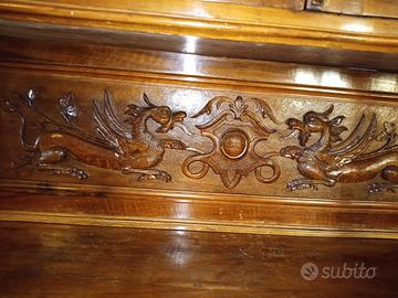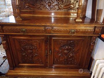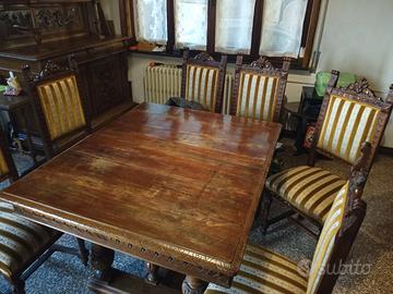 Bellissima sala da pranzo di fine ottocento in legno massiccio, in stile rinascimentale, finemente intagliata. Credenza, tavolo e sei sedie. Prezzo leggermente trattabile. Astenersi perditempo e truffatori vari.