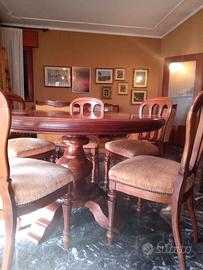 Sala da pranzo in legno massiccio, composta da credenza con ante e cassetti (h 95, l 225, p. 50); cristalliera (h 230, l 190, p 50); tavolo rotondo con 6 sedie imbottite. Dettagli classici e raffinati ideali per ambienti eleganti.