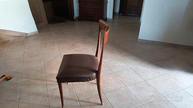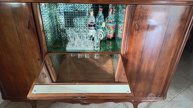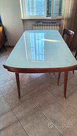 Sala da pranzo in palissandro completa: tavolo con piano in vetro e 4 sedie, credenza madia 5 ante con piano in vetro e specchio, credenza alta con anta bar