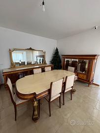 Sala da pranzo in legno composta da buffet con specchio, vetrina, tavolo con piano di marmo e 6 sedie