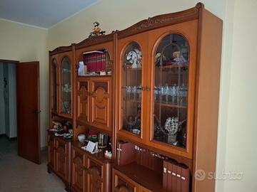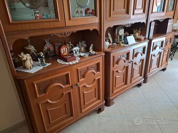 Sala da pranzo in legno massello pesante completa di: mobile 3 pezzi conponibile con vetrine a giorno, libreria e sportelli - tavolo apribile massello + 6 sedie.