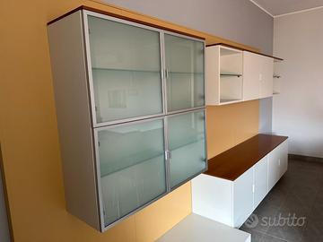 - contenitore pensile l. 210x53 p. 35 laccato bianco opaco con vani a giorno e ripiani in vetro.