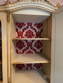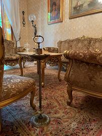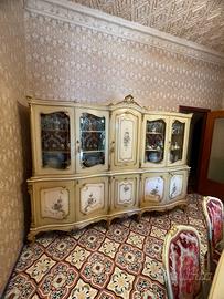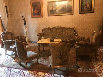 Vendo sala da pranzo in stile barocco veneziano in legno chiaro dipinto completo di tavolo con 6 sedie in legno e velluto e credenza, inoltre il salotto compreso da un divano 3 posti e 2 poltrone e 2 poltroncine.