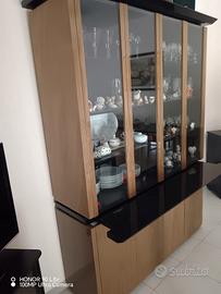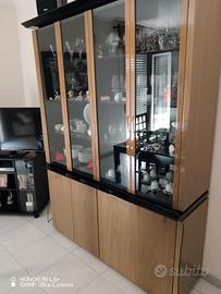 Sala da pranzo completa di mobile vetrina, amabile basso, tavolo in legno con quadrotti di vetro, tavolino porta tv, tavolino basso