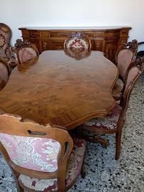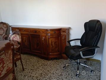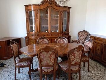 Sala da pranzo che include tutto quello che vedi nella foto. Ottime condizioni di tutti i mobili ad esclusione del piano tavolo che è leggermente rovinato ma si può facilmente sistemare. Comprende credenza alta con ante in vetro, credenza bassa, tavolo + 6 sedie,+2 poltrone + mobile porta tv angolare. In REGALO poltrona ergonomica in pelle nera (leggermente usurata). PREZZO TRATTABILE