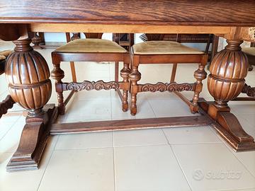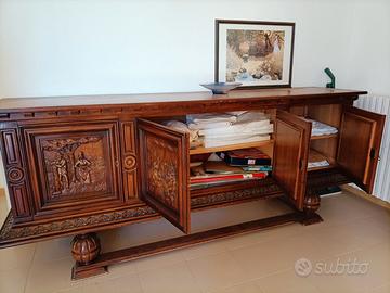 Per amatori. Vendesi per mancanza di spazio sala da pranzo in rovere di quercia massiccio, completamente intagliata a mano in stile rustico adatto per taverna, agriturismo o ristorante. Composta da tavolo misura 1,60 metri x 88 cm. allungabile fino a 2,60 metri; credenza lunga 2,50 metri alta 1,05 metri, profonda 62 cm.; piccola madia lunga 1,12 metri, alta 1,14 metri, profonda 90 cm; numero 6 sedie intagliate con la seduta in stoffa. Tutto originale di circa 60 anni fa. Nel complesso in buone condizioni nessuna presenza di tarlo. Vendesi anche separatamente. Trasporto a carico dell'acquirente, no spedizione. Prezzo 4.500 euro. Se interessati telefonare al 3283068819