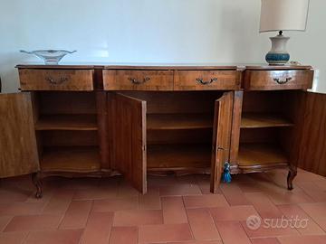 Sala da pranzo completa di cristalliera 122x36x185h., mobile 4 ante 220x52x98h., specchiera 130x85h e tavolo 78x180 allungabile fino a 220 + 6 sedie