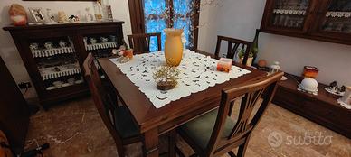 Vendo sala da pranzo in noce composta da un mobile basso con tre cassetti misure 180 x 52 alto 30 cm, un mobile porta TV misura 153 x 52 alto 49 cm, una vetrinetta appesa misure 119 di larghezza 114 di altezza e 29 di profondità, tavolo quadrato da un metro che aperto diventa 140 x 140 con quattro sedie, altra vetrinetta a terra misura cm 115 x 40 alta 103 cm da terra con difetto nella parte sopra come evidenziato nell'ultima foto.
