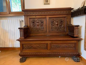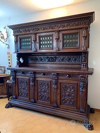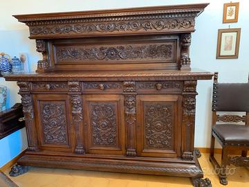 Splendida sala da pranzo rinascimentale in legno intagliato con certificato di autenticità, composta da: