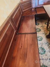 sala da pranzo idonea per sala hobby composta da vetrina, tavolo di 2 metri con tutto intorno panca con sedute ripostiglio e con tre sedie il tavolo si può allungare di altri 60 cm; tutto in legno massello
