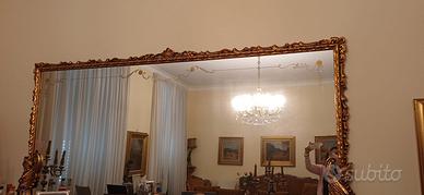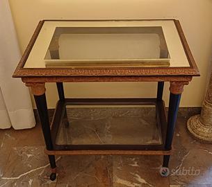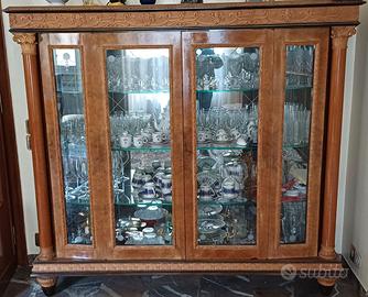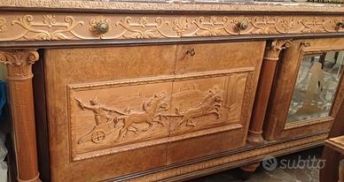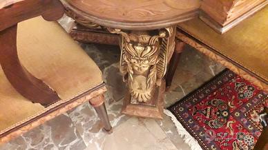 Sala da pranzo in stile impero, tavolo in marmo e particolari in foglia oro 8 sedie in noce e velluto di cui 2 con braccioli credenza in noce con fregi in ottone e specchi molati raffigurati credenza e carrello e colonnina con intarsi