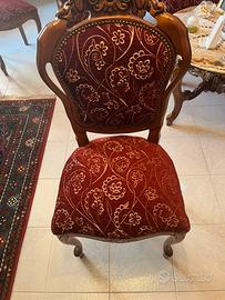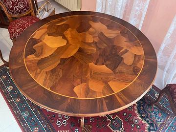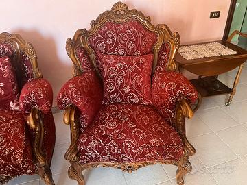 Vendesi bellissimo salotto + sala da pranzo in legno pieno, prodotta negli anni 80/90 riproducendo lo stile francese di Luigi 14. I mobili sono composti da: divano angolare 3 posti, 2 poltrone, 1 tavolino con pianale in marmo, 1 tavola da pranzo allungabile (con disegno ad intarsio), 6 sedie. I mobili sono immacolati, tenuti maniacalmente, senza nessun difetto. Il trasporto è a discrezione dell’acquirente