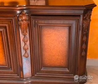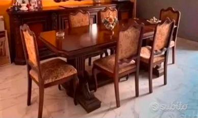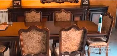 Sala da pranzo in legno massello , composta da 6 sedie con imbottitura da sostituire, un tavolo rettangolare 90 x 2 metri, una credenza di mt. 2.30 di lunghezza a 4 ante, sparecchiatavola lunghezza mt. 3.20 con 5 ampi sportelli. Vendesi anche separatamente i vari pezzi.