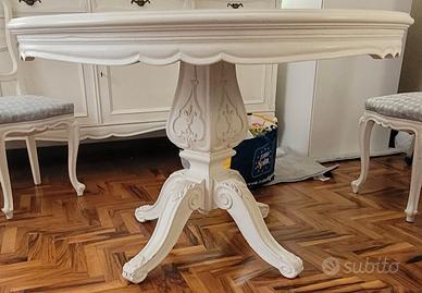 Come da foto cedo tavolo allungabile, 6 sedie, madia e armadio. Mobili classici da sala da pranzo, colore realizzato con pittura a gesso. Le sedie sono state ritapezzate di recente. I mobili in generale presentano piccole imperfezioni. Le ante dell'armadio hanno necessità di restauro. Condizioni generali buone. Vendo tutto insieme, ma valuto la vendita dei singoli oggetti.