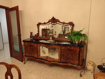 E’ composta da tavolo con 6 sedie, una cristalliera, e due credenze grandi con specchiera speculari.