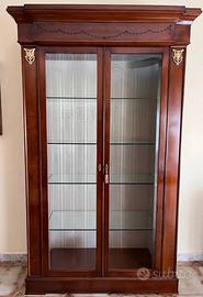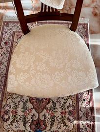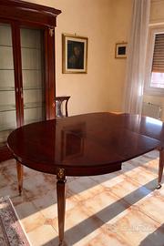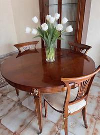 Vendo sala da pranzo, in stile classico lineare, composta da tavolo rotondo in noce massello allungabile fino a 8/10 posti completo di 4 sedie con sedute imbottite color avorio, vetrina alta coordinata e lampadario a sei braccia in vetro Murano , tutto in ottimo stato.