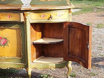 Sala da pranzo in stile provenzale laccata a mano con motivi floreali, composta da tavolo, 8 sedie, credenza e 2 battute a parete.