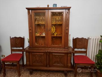 Sala da pranzo stile spagnolo in legno di noce massello... piano del tavolo con qualche imperfezione... 8 sedie con seduta in velluto bordeaux.... Stupendaaaaa