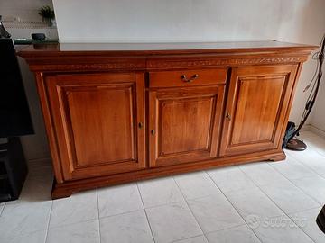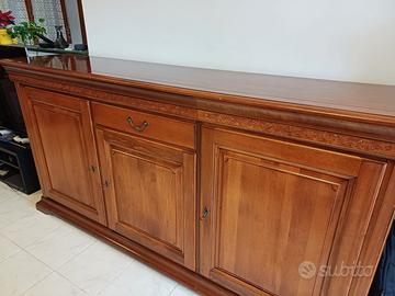 Bellissima sala da pranzo in ottime condizioni marca STILEMA in legno massello acquistata nel 2008. La sala comprende anche un tavolo con 4 sedie stesso stile. Vendibili anche separatamente: Vetrina 400€, Comò 300€, Tavolo con sedie 300€.